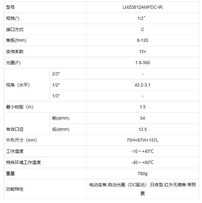 規格1/2",焦距8-120mm(15x),光圈F1.8-360,DC自動光圈,帶預置位功能