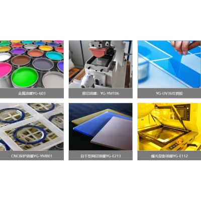 01、曝光顯影油墨/玻璃鏡片油墨02、金屬油墨03、移印/網印油墨04、保護油墨 05、可剝膠