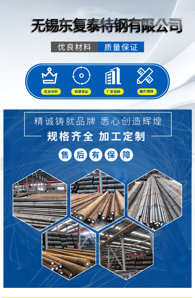 公司簡介   無錫東復泰特鋼有限公司地處華東地區很大的鋼鐵貿易集散地 — 無錫,是一家大型鋼材加工、銷售和配送的企業, 主要以CrMo(鉻鉬系列)、CrNiMo(鉻鎳鉬系列)、CrMnMo(鉻錳鉬系列)、碳素鋼( A105、10#、20#、25#、35#、Q345B)軸承鋼(GCr15,GCR15SiMn);易切削鋼(1215,12L14,1144);彈簧鋼(65Mn,60Si2MnA,50CrVA)螺栓鋼 (25Cr2MoV、25Cr2Mo1V、B16、20Cr1MO1VTiB 、20Cr1Mo1VNbTiB、2Cr12NiMO1W1V 、38CrSi)耐熱鋼(15CrMo ,12Cr1MoV, 1Cr6Si2Mo) (熱作模具鋼,冷作模具鋼,塑料模具等等)銷售東北特鋼、大冶特鋼、興澄特鋼、撫順特鋼、西寧特鋼、巨能特鋼、淮鋼、...