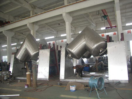 V型混料機一端裝有電機與減速機,電機功率通過皮帶傳給減速機,減速機再通過聯軸器傳給V型桶。使V型桶連續運轉,帶動桶內物料在桶內上、下、左、右進行混合。