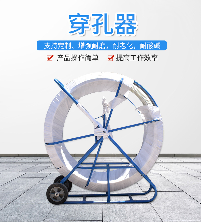 玻璃鋼穿孔器又名(玻璃鋼穿線器、玻璃鋼穿管器,穿孔器,穿管器,電纜穿管器,電纜穿孔器)對于在管道中牽引引導繩是優秀的輔助工具。光滑又富于彈性的表面可使穿孔器輕松地通過狹窄的通道。穿孔器由三部分構成:銅芯、玻璃纖維加強層、高壓低密度聚乙烯防護層(平滑、堅固,可抵抗惡劣環境)。銅芯導體使捅條可以用不同方式輕易安放。璃鋼穿孔器具有省時,省力,提高工效等優點,可用于電信管道清洗及光纜,電纜和塑料子管的布放。使用時首先將玻璃鋼覆桿由引輪引出,然后與相應的金屬頭聯接,穿入管路內。用于清理時,引導頭帶動清理工具,可以清理管道;用于布放電纜時,可先將鋼絲或鐵線帶入,爾后用鋼絲或鐵線牽引電纜入管。桿 11-18mm 100-500m 溫度范圍 -40+80小彎曲半徑 295mm 牽引斷裂張力 4.5T 線密度 150g/m 建筑施工引線用墻壁穿線器,長度30m40m60m80m120m150M200M300M500M 1000米等,可按客戶要求定制。