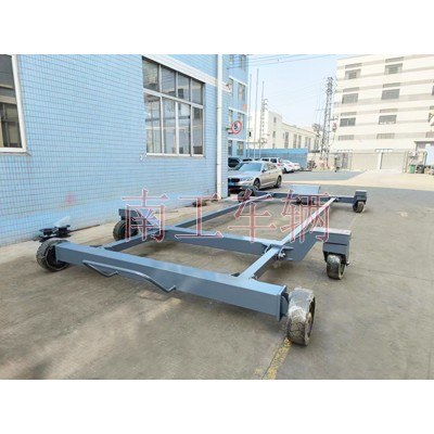 2、拖車配4個18*7-8實心輪胎, 單輪承載2.3T,前車前部兩輪與牽引架鏈接實現轉向引導作用,兩側兩個輪胎為萬向輪起到平衡與輔助承載作用,中部配置兩個18*7-8輪胎,萬向輪起到平衡與輔助承載作用,后部為單橋機構,配兩個18*7-8輪胎,單載2.3T;