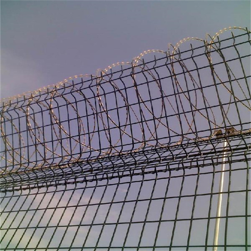 (3)監獄刀片刺繩由刺絲連接卡扣與固定在支架上的縱向拉筋相連接。縱向拉筋與支架的連接采用Φ2.5mm的冷拔鍍鋅鋼絲繞2圈后擰緊固定。支架設置在跨度3m防護柵欄的立柱和跨中位置,其中跨度進設置與立柱上部,支架與防護柵欄采用支架抱箍連接,對于已經安裝金屬網片的防護柵欄。監獄刀片刺繩直接采用Φ2.5mm的冷拔鍍鋅鋼絲或刺絲連接卡扣固定于金屬網橫片和金屬絲上。