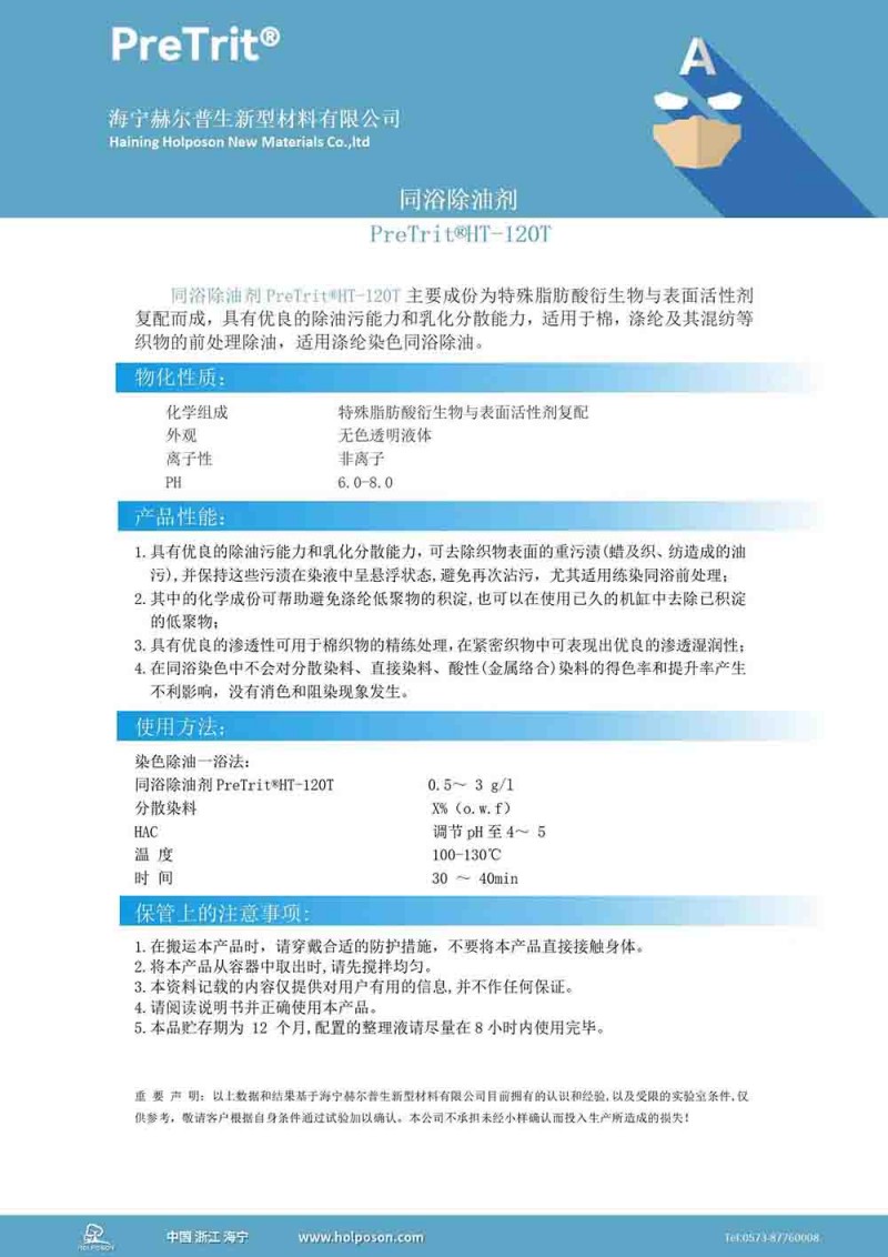 同浴除油劑PreTrit?HT-120T主要成份為特殊脂肪酸衍生物與表面活性劑復(fù)配而成,具有優(yōu)異的除油污能力和乳化分散能力,適用于棉,滌綸及其混紡等織物的前處理除油,特別適用滌綸染色同浴除油。