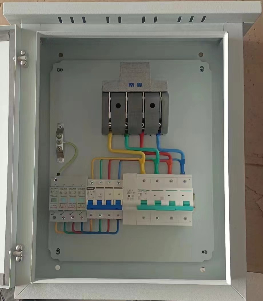 一、戶用光伏配電箱基本構成 戶用配電箱一般由刀開關、自復式過欠壓保護器、斷路器、浪涌保護器后備斷路器、和浪涌保護器組成。