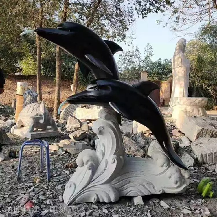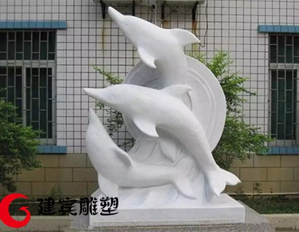 常見石雕海豚的造型通常采用其躍出水面的的形態,其長長尖尖嘴巴和流線一般修長勻稱的身體構成了一座美麗的雕塑。常被安置在草坪、公園、景區、廣場等地,還有的是作為噴泉雕塑的形象。無論是哪樣它們都裝點了城市