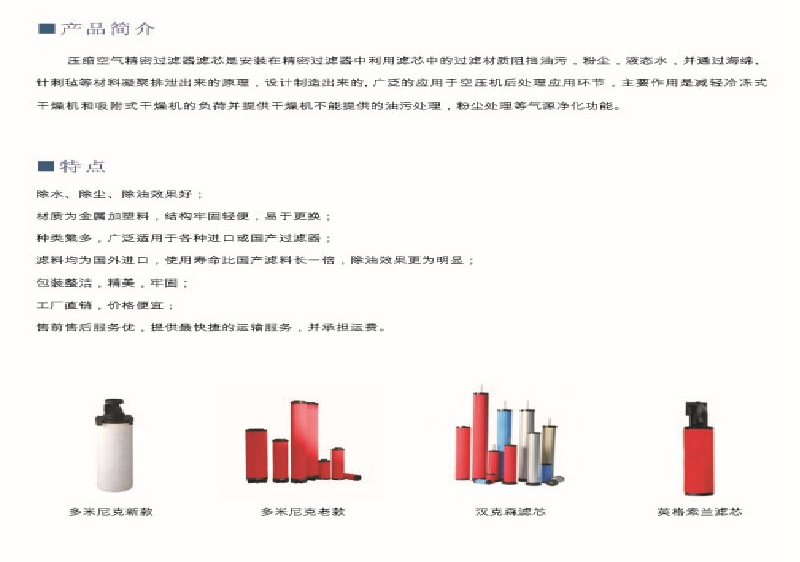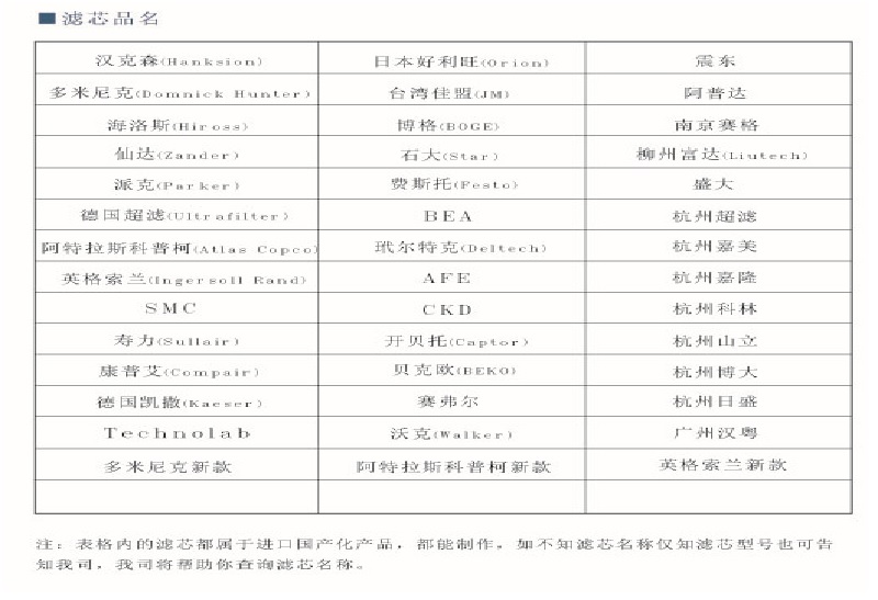 國產品牌濾芯均為我司生產的替代原廠品牌濾芯,其過濾濾材采用德國原裝進口HV公司產品,注冊商標為“佳潔”牌。本公司涉及的其它品牌均無品牌意義,只是作為產品型號參照和客戶選型對照使用。進口濾芯和過濾器為原裝進口,有防偽標志。我司長期為國內各大企業貼牌生產各種款式的壓縮空氣精密過濾器濾芯。歡迎來電咨詢!
