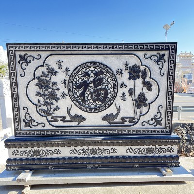 石雕影壁墻作為漢族建筑中重要的單元,它與房屋、院落建筑相輔相成,組合成一個不可分割的整體。雕刻精美的影壁具有建筑學和人文學的重要意義,有很高的建筑與審美價值。石雕影壁墻磚雕裝飾是講究的影壁最重要的元素,內容主要體現吉祥富貴、長壽幸福、趨吉避邪的含義,體現形式多以花草、動物、神話人物故事等相互組合,以諧音、象征、會意的方式產生出豐富多樣的吉祥寓義圖案。回形紋、萬字紋、扯不斷、連珠紋寓意延綿不斷,番草寓意延綿,梅寓意耐寒,蘭寓意幽香,竹寓意有節,菊寓意傲霜,牡丹寓意富貴,荷花寓意出污泥而不染、清廉,松寓意長青,水仙寓意群仙,海棠寓意滿堂,桃花寓意春光,月季寓意四季,靈芝寓意如意、仙氣。