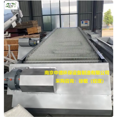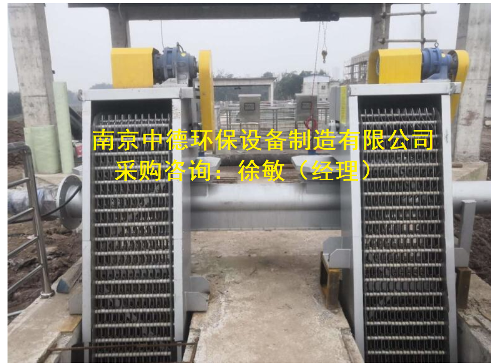 該設備是由ABS工程塑料、尼龍或不銹鋼制成的特殊形耙齒,按一定的排列次序裝配在耙齒上形成閉式耙齒鏈,其下部安裝在進渠水體中。當傳動系統帶動鏈輪作勻速定向旋轉時,整個耙齒鏈便自上而下運動,并攜帶固體雜物從液體中分離出來,流體則通過耙齒的柵隙流過去,整個工作狀態連續進行。由于耙齒的特殊結核形狀,使耙齒鏈攜帶雜物到達上端反向運動時前、后排耙之間產生相對自清運動,促使雜物依靠重力脫落,同時設備后面設置的一對膠板刷以保證每排耙齒運動到該位置時都能得到*的刷凈作用。