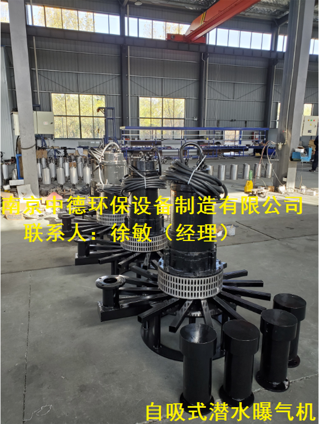 新式離心曝氣機由潛污泵、混合室、底座、進氣管和組成。    進氣管上端為空氣吸入口位于水面之上,下端與混合室連通接通電源后由于葉輪旋轉,高速水流從葉輪