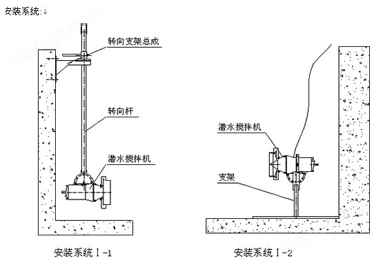 安裝系統Ⅰ只適用池深<4m,機型為QJB0.85/8-260/3-740C和QJB1.5/6-260/3-980C攪拌機,其中Ⅰ-1可在水平方向和垂直方向進行調節;