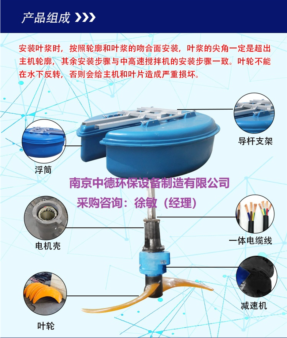 3、攪拌機的動力為潛水電機,應用時潛入液下工作,不僅冷卻條件好,適用深度范圍廣,而且不會產生噪聲等二次污染。