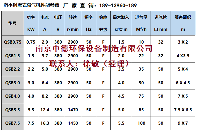 注:表中進氣量及增氧能力是在標準試驗條件下(20°C水溫,氣壓101.325kPa),曝氣機潛水深度3m,試驗介質為清水。在中度污水中,增氣能力可按系數0.85作為設計依據。