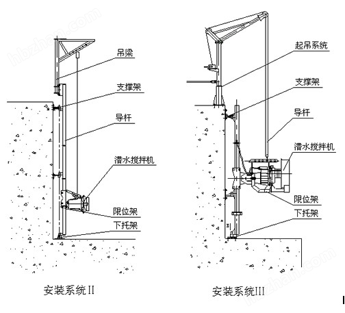 安裝系統Ⅰ只適用池深<4m,機型為QJB0.85/8-260/3-740C和QJB1.5/6-260/3-980C攪拌機,其中Ⅰ-1可在水平方向和垂直方向進行調節;
