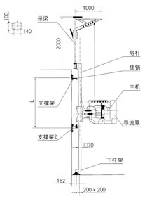 當池深H>4米時建議采用安裝系統Ⅱ,需在池底做一混凝土基礎(或鋼結構底座)。起吊系統底座、鋼繩固定架和導向底座與池的有關聯接面均采用膨脹螺栓固定,無需預留孔。安裝系統Ⅱ用導向鋼繩導桿,具有運輸方便、現場安裝簡單等特點。該系統從根本上避免了由于運輸引起導桿彎曲、變形有而影響正常使用的情況,并有效改善了池深過深情況下,由于導桿的安裝誤差而導致的無法正常起吊等現象。在有懸臂池頂(如圖)的安裝條件下更顯得操作方便可靠。