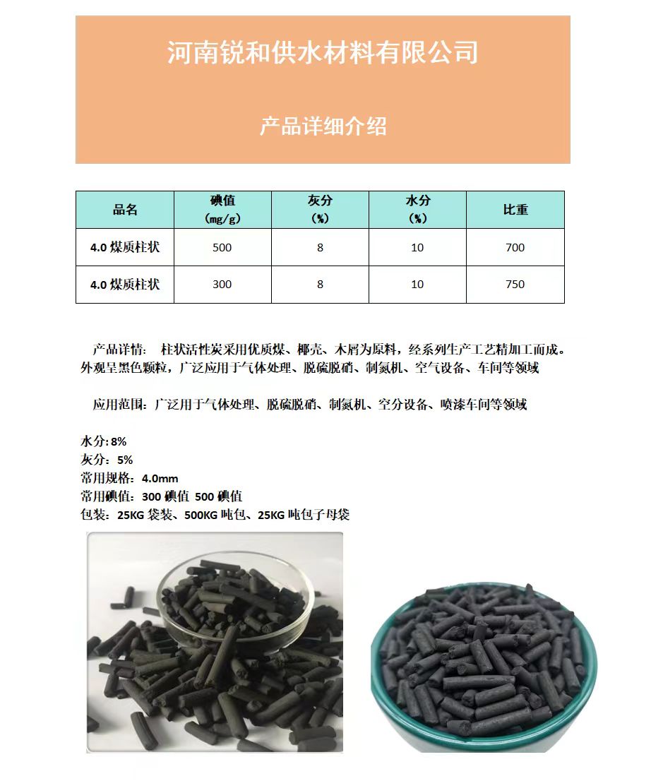 更新信息 快采購網供應商河南銳和供水材料有限公司供應銳和脫硫脫硝4mm柱狀活性炭,為您提供詳細的產品報價、參數、圖片等商品信息,本產品于2025-10-29 09:14更新,主要更新內容為:產品類別、產品參數、產品價格、產品圖片等信息。如需進一步了解銳和脫硫脫硝4mm柱狀活性炭詳細信息,請與廠家直接聯系,并說明是在快采購網看到這條商機的。