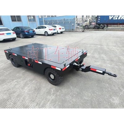 3噸電動手動牽引兩用平板拖車 黑色南工車輛長期非標訂制,兩用平板拖車屬自走式電動底盤,同時兼備自走牽引兩種功能,非自動行走時可牽引拖行,外觀精美,操作簡單!