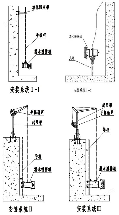 ◎通過起吊裝置上的鏈條的調節,使得潛水攪拌機沿導桿或導向鋼絲滑下過程中,起吊鉤和潛水攪拌機的起吊重心處于同一垂直線上。