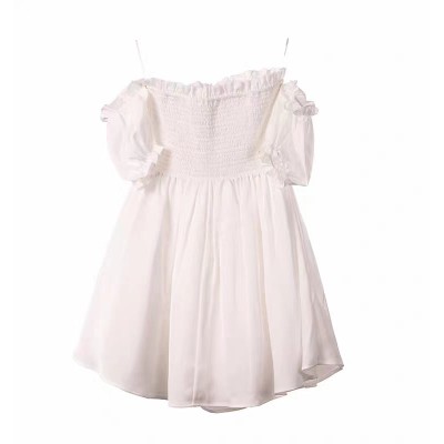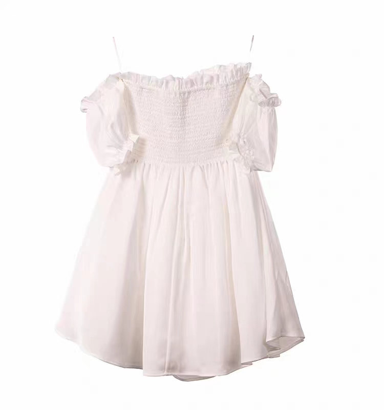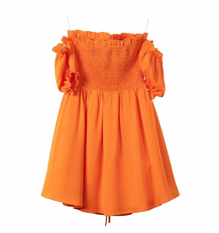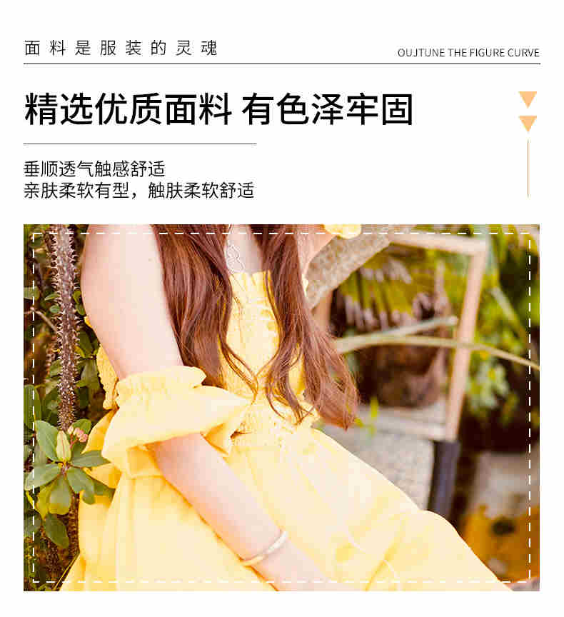 那充滿彈力的褶皺設(shè)計,宛如靈動的音符歡快地跳躍在裙身之上,每一道褶皺都似在訴說著浪漫與柔情的故事。一字露肩領(lǐng)大膽而性感,恰到好處地勾勒出女性迷人的肩部線條,散發(fā)出魅力與風情,令人過目難忘。木耳邊向上領(lǐng)仿若靈動的花瓣,為裙子增添了一抹俏皮與可愛,隨著一舉一動輕輕搖曳,盡顯活潑靈動的氣息。