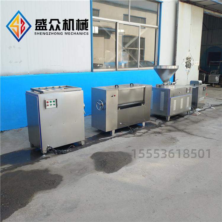 臘腸生產線:絞肉機→真空滾揉機→液壓灌腸機→扎線機→烘干爐→真空包裝機→成品