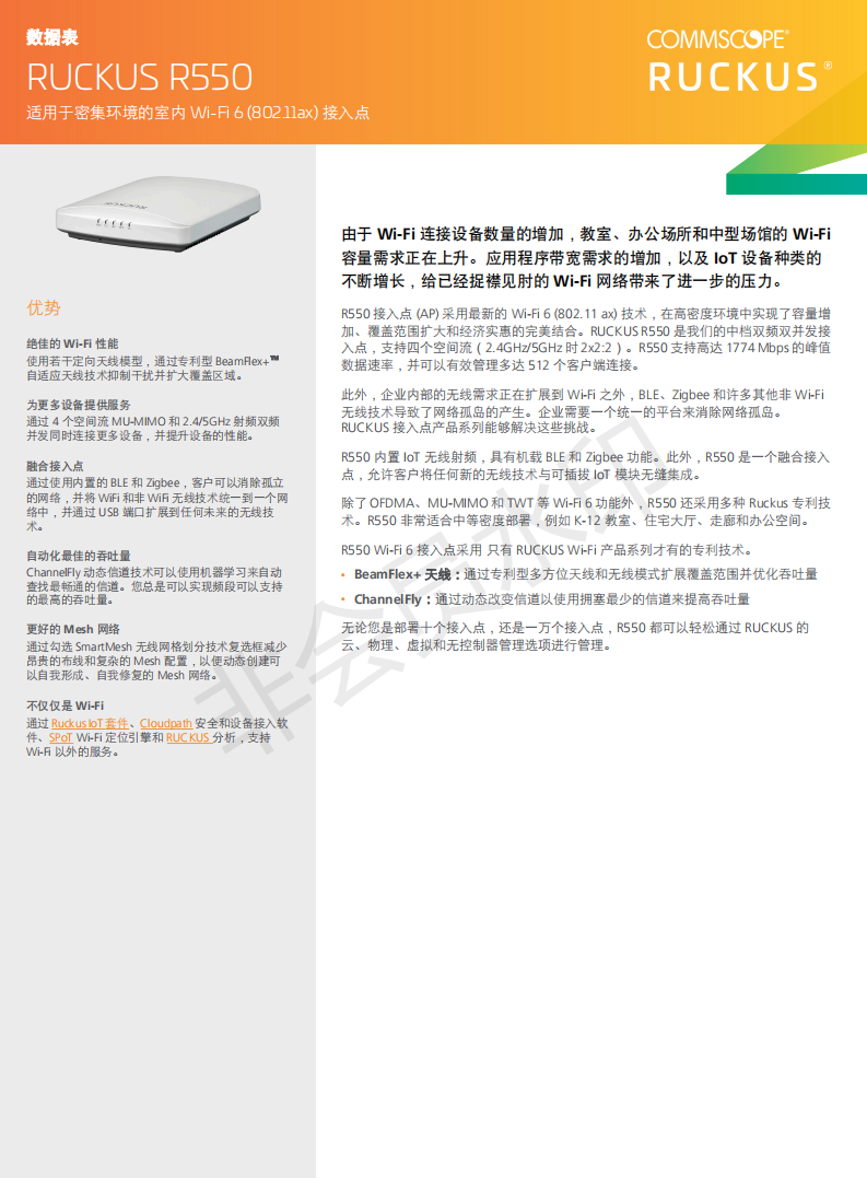 "提升網絡容量與效率:RUCKUS R550室內AP,采用Wi-Fi 6技術,提供高達1774Mbps的峰值數據傳輸速率,支持512個客戶端同時連接。適用于K-12教室、學生宿舍、辦公空間等中等密度部署環境。"