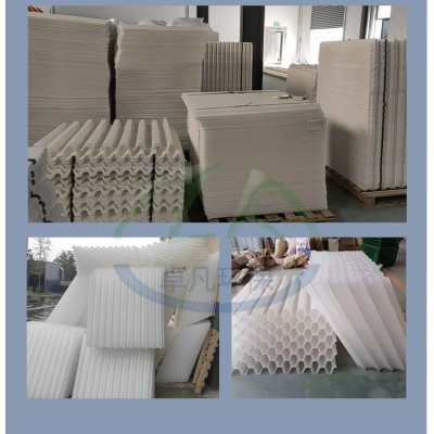 蜂窩斜管采用改性乙丙共聚塑料為材料,紅外線恒溫機械熱拉成六角管狀,然后采用專利技術,高頻焊接成整體產品,到客戶現場安裝。蜂窩斜管主要用于各種沉淀和除砂作用。是近十年來在給排水工程中采用最廣泛而且成為一項水處理裝置。它適用范圍廣,處理效果高,占地面積小等優點。適用于進水口除砂,一般工業和生活給水沉淀、污水沉淀、隔油以及尾張濃縮等處理,即適用于新建工程,又適用于現有舊池的改造,均能取得良好的經濟效益。