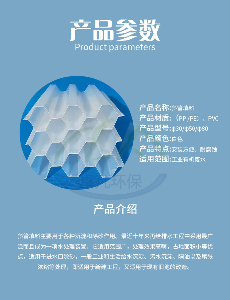 產品規格:Φ25mm、Φ35m、Φ50mm、Φ80mm 訂貨須知:訂貨需明確所需斜管填料的規格、長度、厚度、數量等。