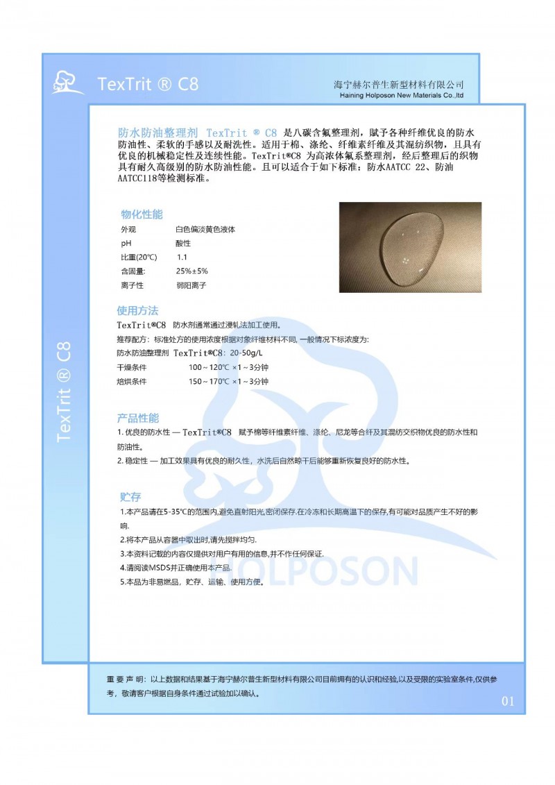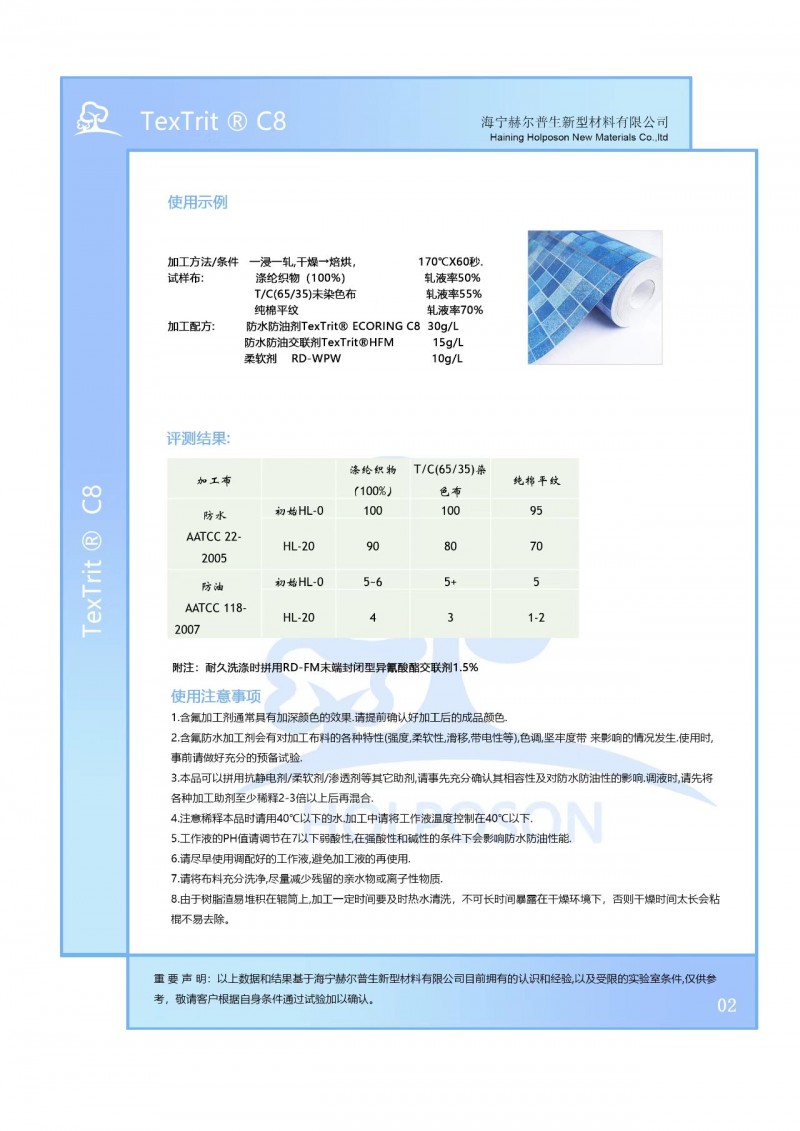 HOLPOSON? C8 防水劑通常通過浸軋法加工使用。