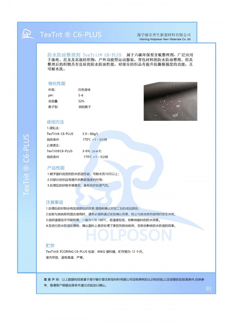 HOLPOSON? ECORING C6-PLUS  屬于六碳型含氟整理劑,廣泛應用于滌綸、尼龍及其混紡織物,戶外功能型運動服裝、背包材料的防水防油整理,經其整理后的織物具有良好的防水防油性能。對部分紡織品有提升抗撕裂強度的功能,且可耐水洗。