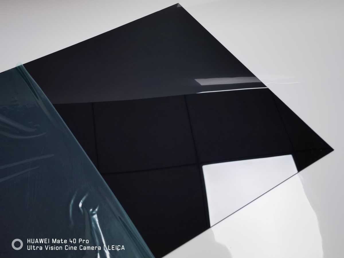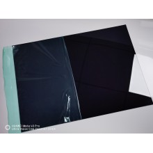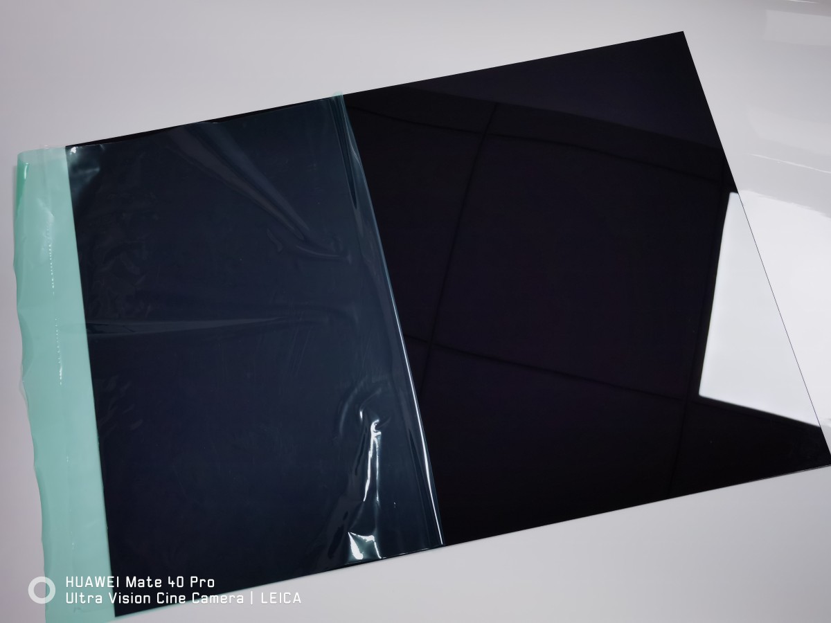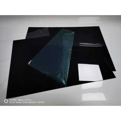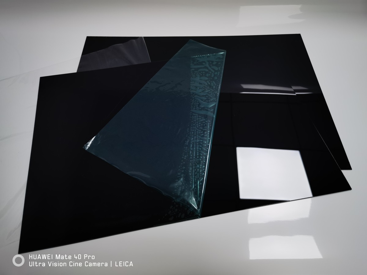 雙面光亮黑色PC片狀材料,兩面帶保護膜(一面綠膜,一面白膜)