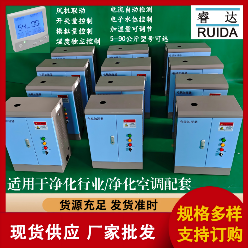 本公司電極式加濕器自配濕度控制器,也可選擇開關(guān)量、模擬量、比例量遠(yuǎn)程控制,電極式加濕器適用行業(yè):凈化工程配套使用,凈化空調(diào)配套加濕,潔凈室,實(shí)驗(yàn)室用,大型空調(diào)機(jī)組用。電極式加濕器是潔凈等溫加濕,加濕均勻,蒸汽輸出量在5-120kg/h可選。電極式加濕器結(jié)構(gòu)緊湊,占用空間小,蒸汽加濕,主機(jī)外觀設(shè)計(jì)美觀大方,同時(shí)注重功能與配套的組合。潔凈加濕安裝緊湊.
