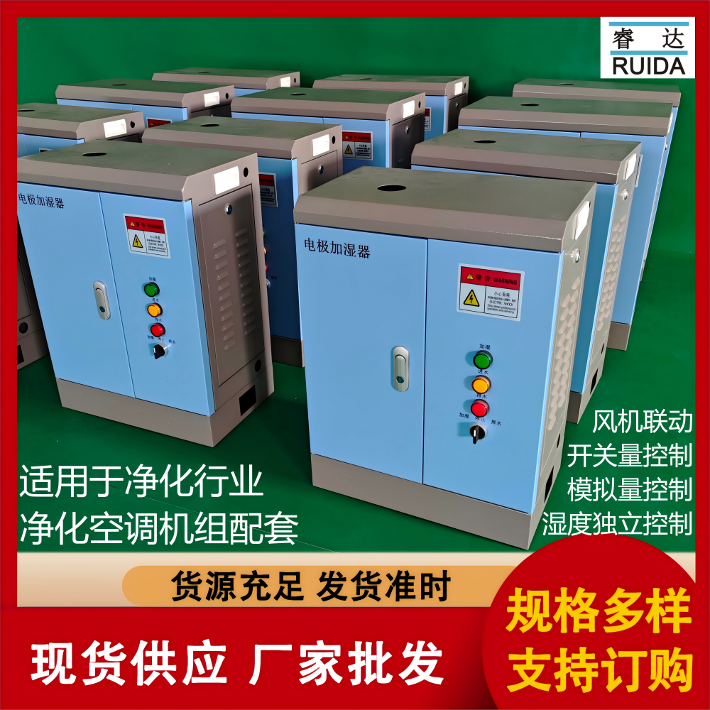 本公司電極式加濕器自配濕度控制器,也可選擇開關(guān)量、模擬量、比例量遠(yuǎn)程控制,電極式加濕器適用行業(yè):凈化工程配套使用,凈化空調(diào)配套加濕,潔凈室,實(shí)驗(yàn)室用,大型空調(diào)機(jī)組用。電極式加濕器是潔凈等溫加濕,加濕均勻,蒸汽輸出量在5-120kg/h可選。電極式加濕器結(jié)構(gòu)緊湊,占用空間小,蒸汽加濕,主機(jī)外觀設(shè)計(jì)美觀大方,同時(shí)注重功能與配套的組合。潔凈加濕安裝緊湊.