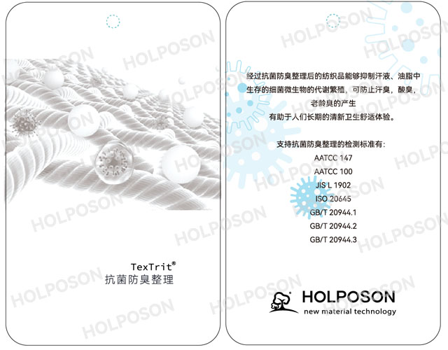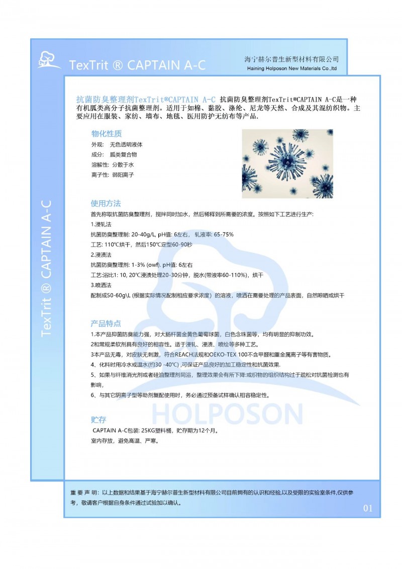 抗菌防臭整理劑HOLPOSON?CAPTAIN A-C是一種有機胍類高分子抗菌整理劑。適用于如棉、黏膠、滌綸、尼龍等天然、合成及其混紡織物。主要應用在服裝、家紡、墻布、地毯、防護無紡布等產品.