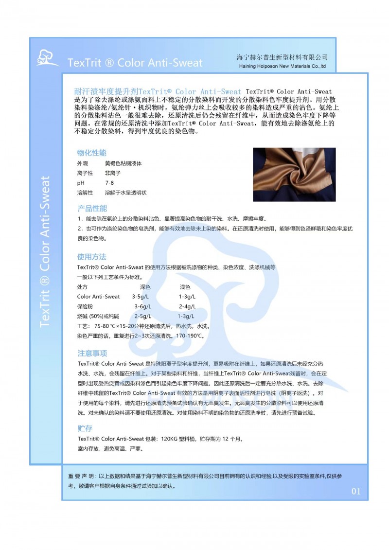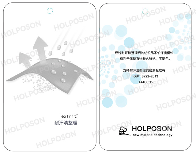 HOLPOSON? Color Keep-Sweat  是為了除去滌綸或滌氨面料上不穩(wěn)定的分散染料而開(kāi)發(fā)的分散染料色牢度提升劑。用分散染料染滌綸/氨綸針·機(jī)織物時(shí),氨綸彈力絲上會(huì)吸收較多的染料造成嚴(yán)重的沾色。氨綸上的分散染料沾色一般很難去除,還原清洗后仍會(huì)殘留在纖維中,從而造成染色牢度下降等問(wèn)題。在常規(guī)的還原清洗中添加HOLPOSON? Color Keep-Sweat,能有效地去除滌氨綸上的不穩(wěn)定分散染料,得到牢度優(yōu)良的染色物。