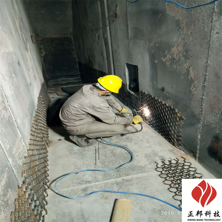 4、施工:將施工部位清理干凈,內壁不得粘有雜物浮塵。清理龜甲網或扒釘上面浮著物,清干凈施工工作面浮塵、雜物、然后用手工涂抹耐磨陶瓷涂料,施工部位可用鐵板等工具弄平整、光滑、接口要緊密。對于施工面積較大或厚度大于50mm以上部位要加焊錨固件,且間距不大于50mm。