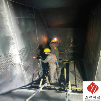 4、施工:將施工部位清理干凈,內壁不得粘有雜物浮塵。先清理龜甲網或扒釘上面浮著物,清干凈施工工作面浮塵、雜物、然后用手工涂抹耐磨陶瓷涂料,施工部位可用鐵板等工具弄平整、光滑、接口要緊密。對于施工面積較大或厚度大于50mm以上部位要加焊錨固件,且間距不大于50mm。