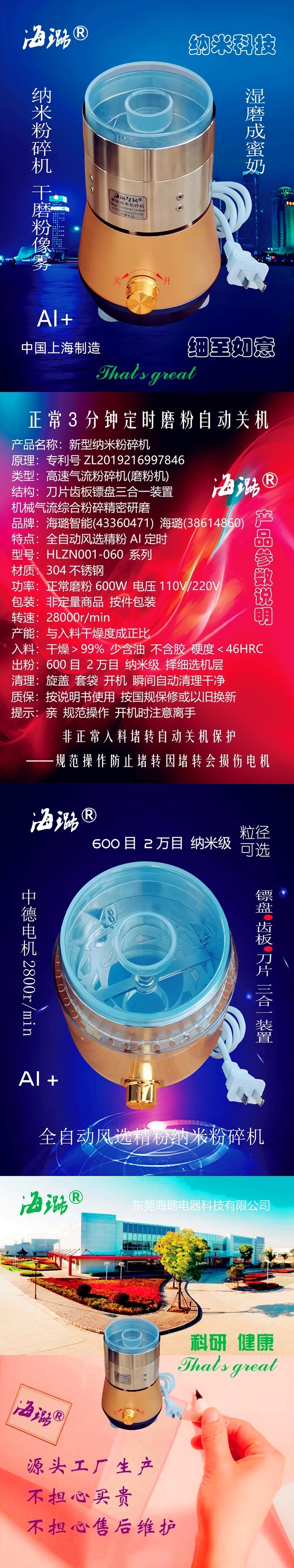 公司簡介 東莞海璐智能電氣有限公司榮譽出品智能納米粉碎機。海璐智能納米粉碎機設計科學,外形新穎,結構緊湊,使用方便。與同類產品相比,其制造精美、高速、精密地磨削功能好。海璐智能納米粉碎機用于非金屬材料的切割、研磨和均質;很是適合衛生、酒店、賓館、家庭使用。制作食品飲料、調味品、化妝品等。海璐智能納米粉碎機其智能機芯必將取代當今各種粉碎機。海璐智能納米粉碎機助人類生活得更美好,家庭幸福,身體健康。歡迎各大媒體及朋友企業合作共贏!
