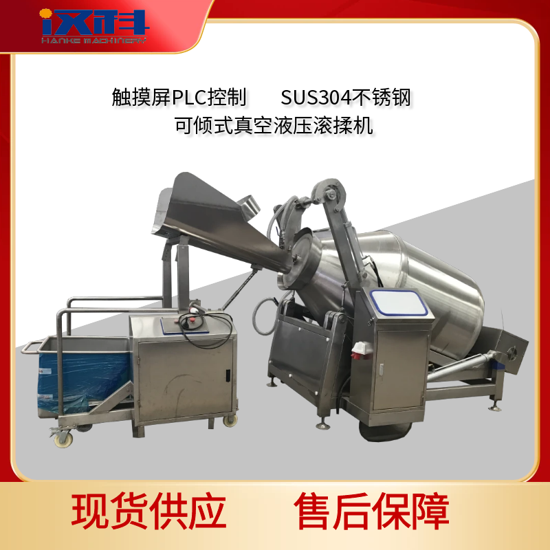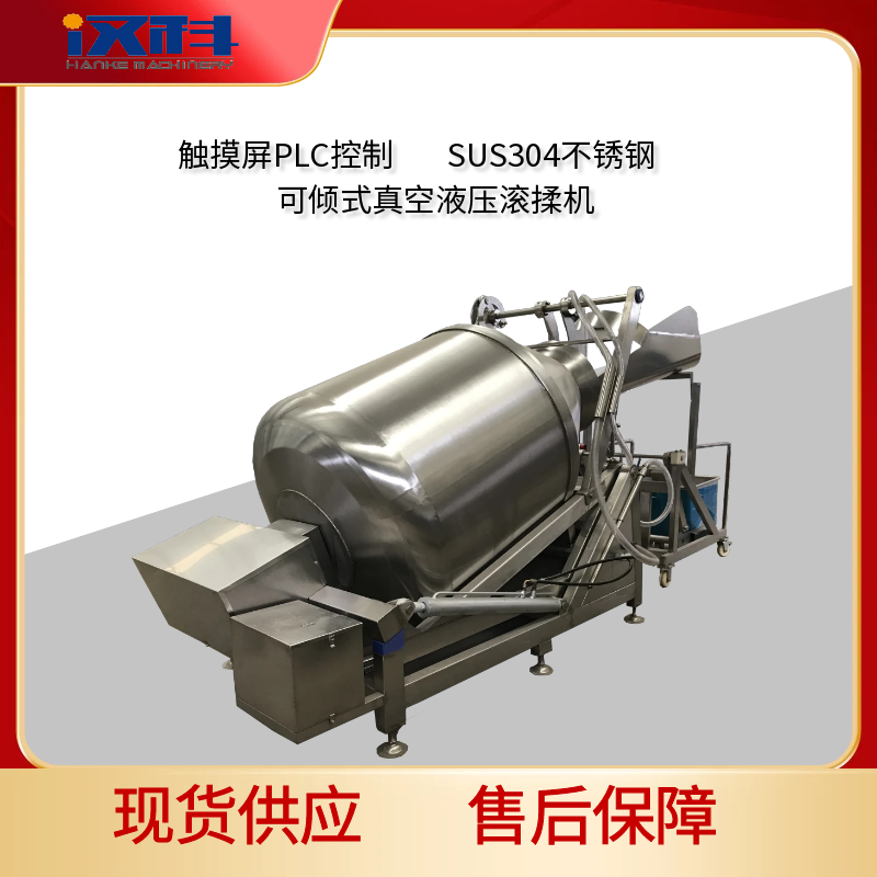 真空滾揉機也叫真空腌制機,主要是將加工的肉類,如牛肉,羊肉,雞肉,鴨肉,鵝肉,豬肉,魚肉,蛋及蔬菜,果品放在真空狀態內,可提高調味品進入肉品的速度,保持肉內的水分。真空滾揉機是將塊狀肉在真空狀態下,通過筒體轉動進行滾揉。筒體轉動時,塊狀肉在真空狀態下膨脹,纖維組織被拉開,在U型齒的作用下沿筒壁作向前→向后→向里→向前的回旋運動,互相擠壓,同時沿筒壁切向翻滾、摔打。這樣使肉體蛋白質分解成水溶性蛋白,易被人體吸收。