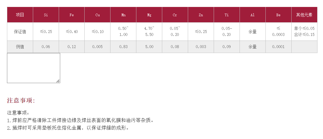 符合 符合 GB/T 10858 SAl 5556AWS A5.10 ER5556/R5556EN ISO 18273-S Al 5556 說明: JQ?SAl 5556是含5%鎂、0.8%錳及少量鉻、鈦元素的鋁鎂合金焊絲;焊接工藝性能優良,電弧穩定、飛濺小,焊縫成形美觀光亮。焊絲特點: 1.焊縫金屬具有高的強度,良好的抗腐蝕性能和抗熱裂性能; 2.能夠為經陽極處理的焊接提供良好的配色。 用途: 適用于船舶結構框架、鐵路工業、汽車零件、集裝箱、拖車、軍工裝備等領域強度較高的5XXX系列鋁鎂合金(如5083和5456)的焊接。