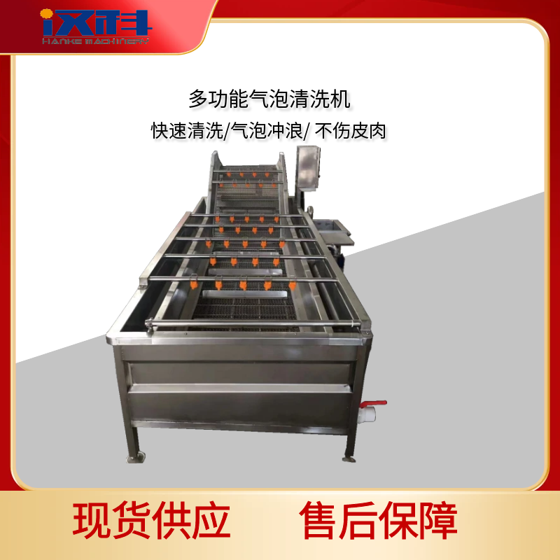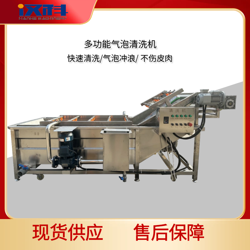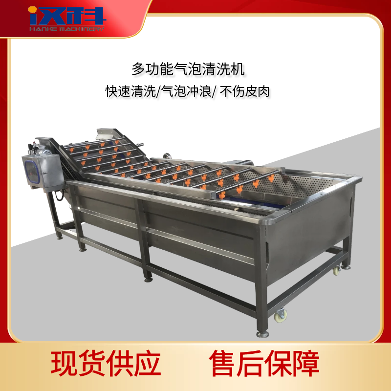 氣泡清洗機的設計通常包括架體、水箱、鼓泡發生器、網帶、循環水泵、傳動部分、電器部分等。設備運行平穩、使用壽命周期長、清洗效果好,這種清洗方式適用于果蔬、醬菜等多種食品的清洗,提高了清洗質量。