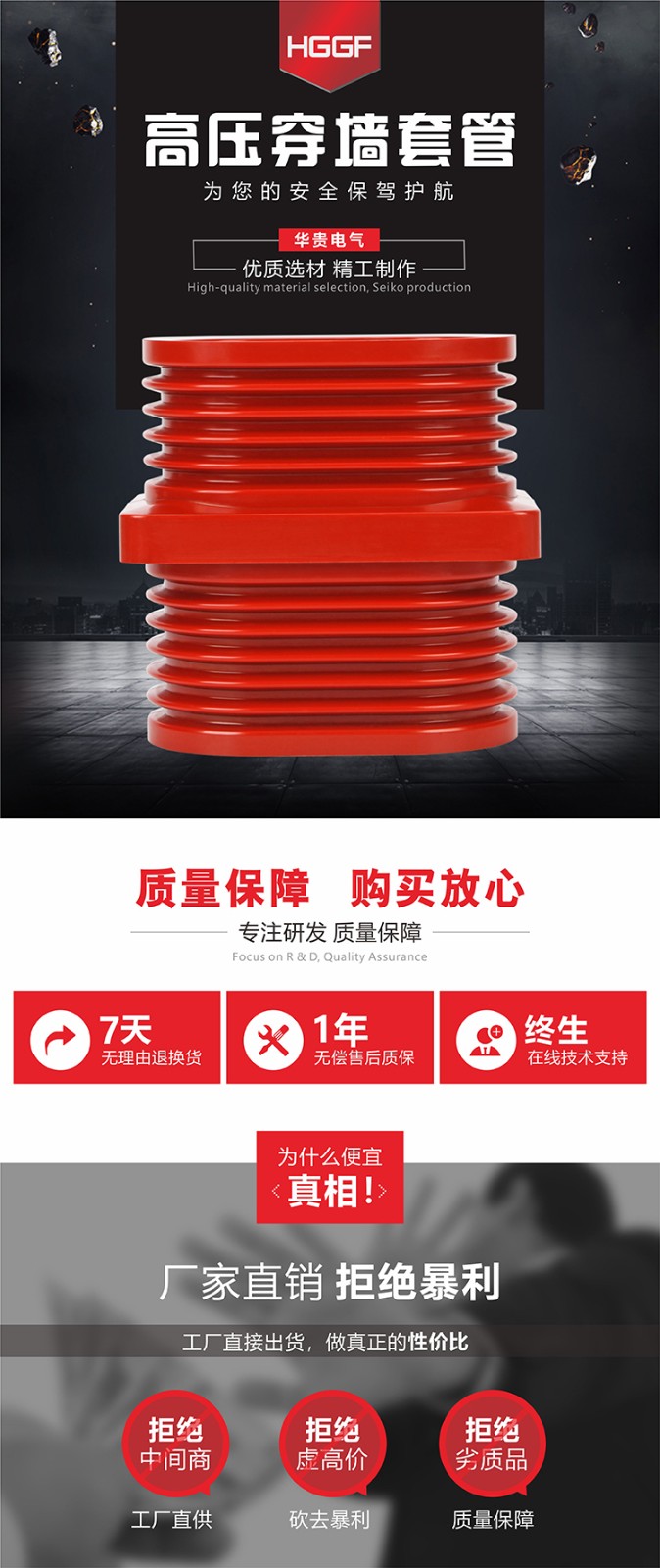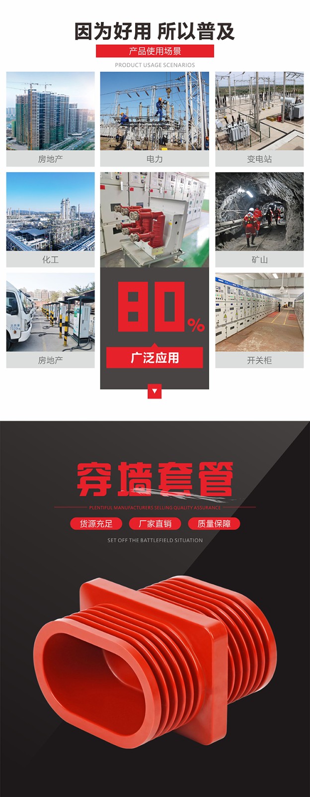 高壓穿墻套管適用于額定電壓(10~35)kV, 頻率(15~60)Hz的三相交流系統電站和變電所配電裝置上 ,供導電部分穿過隔板、墻壁或其它接地物,起絕緣支持和外部導線(母線)間固定連接之用。