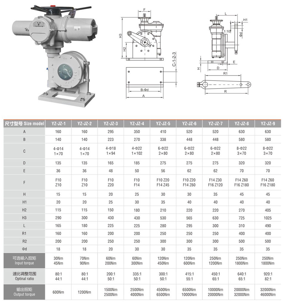 基座拐臂式齒輪箱(蝸輪箱)主要應用于風門、蝶閥、球閥、旋塞閥、旋球閥等90°啟閉的閥門,其基座尺寸可以根據使用現場定做。輸出扭矩從300Nm 到400000Nm, 目錄冊只提 供了9個基座的常規連接尺寸,產品設計靈活,安裝方便,配套球型鉸鏈合理。齒輪箱速比可根據現場的開啟時間,電裝的輸入扭矩以及轉速進行調整,這樣對輸 入電裝有很多選擇,不同的輸入扭矩和不同的轉速相結合達到現場合理的使用工況。電動型蝸輪頭,風門齒輪箱,旋球閥驅動裝置,蝶閥球閥配套廠家。