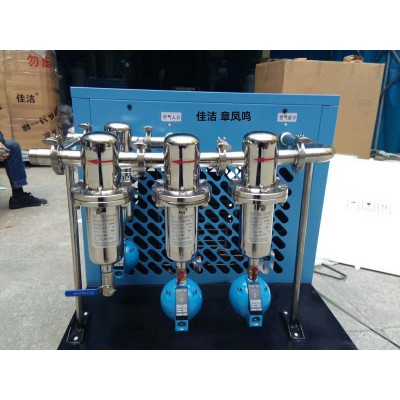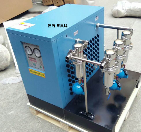 冷干機特點:1、制冷壓縮機采用高溫型全封閉制冷壓縮機,運轉穩定,噪聲低,性能可靠,省電壽m長。 2、熱交換器、冷凝器選用g效螺紋管,傳熱系數高,因而體積小,結構緊湊。筒體材料選用不銹鋼或碳鋼鍍鋅,可避免對奪壓縮空氣的二次污染。 3、制冷控制元件均采用制冷元件,性能優良,具有熱力膨脹閥的節流降壓功能,熱氣旁通閥的能量調節功能,油分離器的冷凍油的油分保護功能,冷媒高低壓控制器的冷媒高低壓保護等功能。 4、氣液分離采用旋風分離與不銹鋼絲網捕霧有機結合的氣液分離器,具有氣液分離效果徹底,避免水份的二次蒸發,冷干機的干燥效果的重要作用。它比旋風分離器分離效果好得多,同時又比過濾式氣液分離器使用成b低,具有較市制性能價格比。 5、設備結構設計合理,便于維護保養,箱式外形,美觀大方。 6、無基礎安裝。 7、實時顯示運行參數。