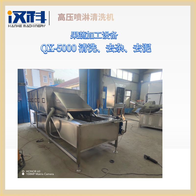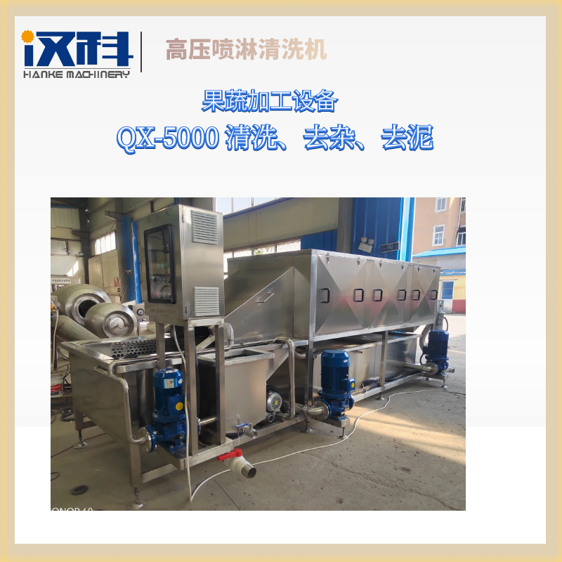 物料進入水槽,在氣泡裝置水流下被充分打散、翻滾、清洗、網帶傳送到高壓噴淋段,從物料表面洗脫的泥沙沉入底部隔離倉,不會發生翻揚回流造成的再度污染。物料進入高壓噴淋裝置,漂浮在水中的雜物、小蟲通過高壓裝置清洗干凈,洗凈的物料由出水口再經噴淋清洗送至下道工序。該清洗機能有效去除物料表面的污染物、以及農藥殘留,且對物料無損傷。清洗機清除蔬菜表面的污染物而且可以縮短清洗時間,省時、省力、省水、清潔度高。此設備可以搭配輸送帶進行物料的挑選分揀,也可以搭配風干線,進行果蔬、醬菜的深加工。設備根據物料產品的不同可以進行定制加工。