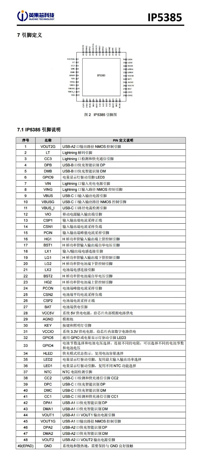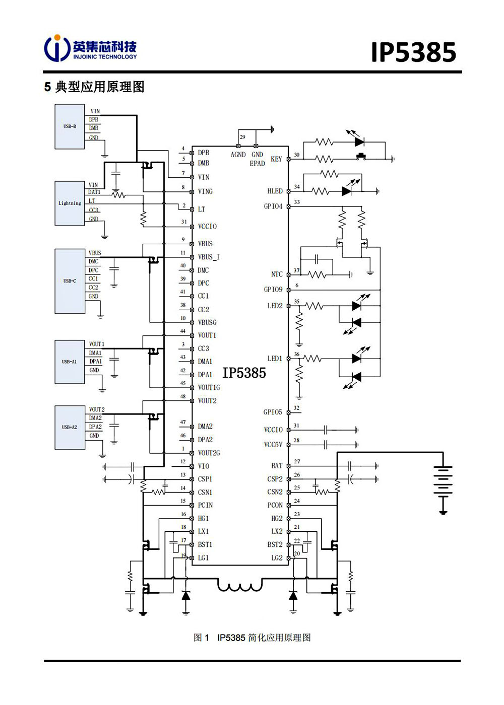 綜上所述,IP5385作為一款功能強(qiáng)大、高度集成的電源管理SOC,憑借其多USB口支持、多種快充協(xié)議、高可靠性及簡潔的BOM等特點,在移動電源、便攜設(shè)備、電動工具等領(lǐng)域具有廣泛的應(yīng)用前景。