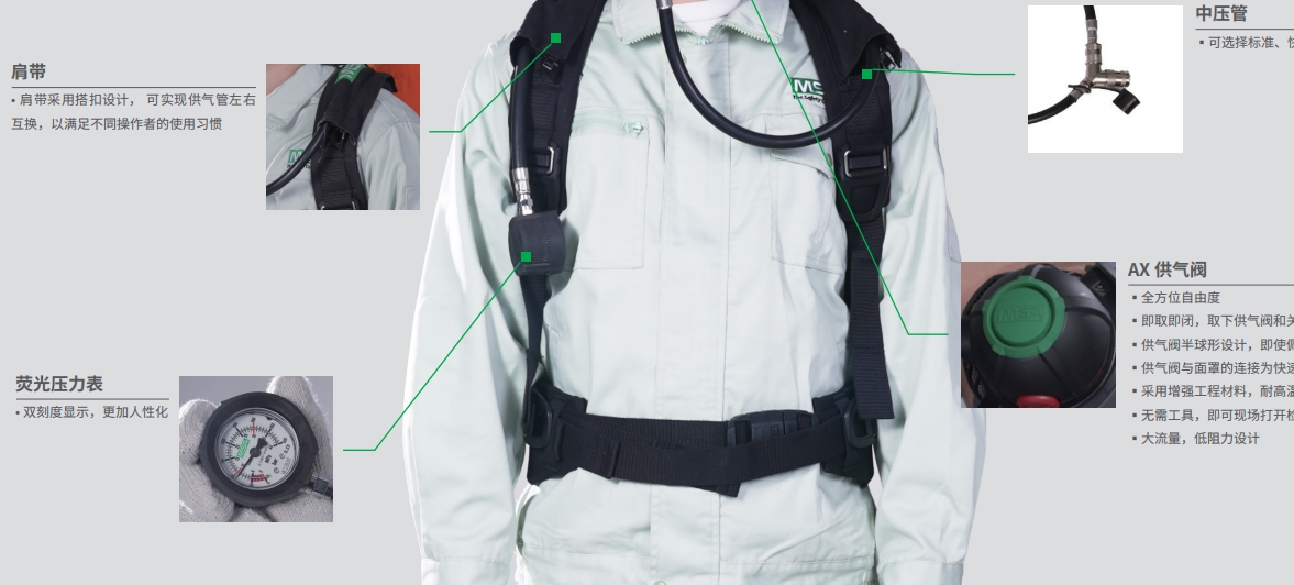 全新肩帶設計,采用搭扣設計,可實現供氣管左右互換,以滿足不同操作者的使用習慣。