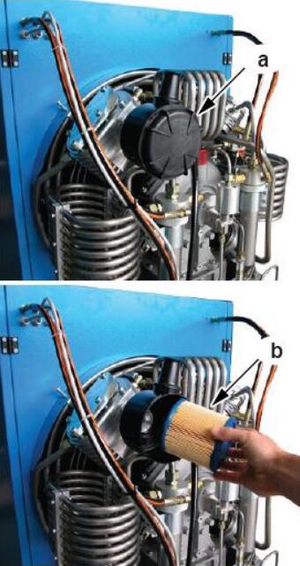更換空氣過濾器: 進氣空氣過濾器需要每隔 25 小時檢查一次, 有灰塵的話可以轉動 90 度,轉動三次后應該 更換。如下圖。 可以用壓縮空氣吹掃過濾器的表面灰塵,如吹 不掉,請更換。