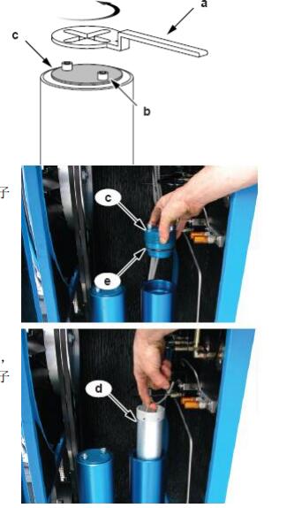 更換分子篩活性碳過濾器: 活性碳分子篩飽和后需要更換,更換的 方法如右圖所示。 MCH30 的分子篩活性碳過濾器在 20 度 的環境溫度時 67 小時需要更換。 MCH36 的分子篩活性碳過濾器在 20 度 的環境溫度時 55 小時需要更換。 用隨機附送的專用工具卡住兩顆螺絲 B 之間(如右圖),逆時針轉出過濾筒的蓋子 C。 然后用手扣住過濾器的拉環,拔出過濾器, 并裝入新的過濾器后,重新將過濾筒的蓋子 C 擰緊。