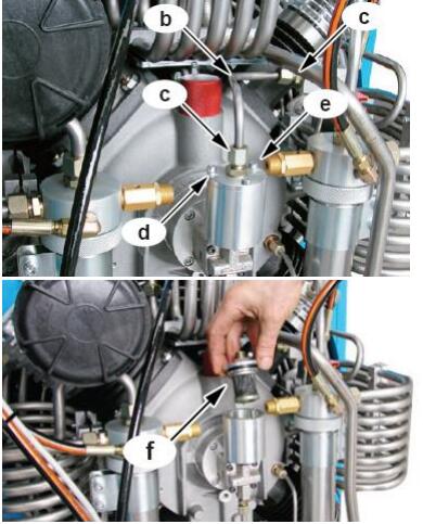 機油過濾器的更換: 機油過濾器需要每年或 250 小時 進行更換(以先到的為準) 1) 如右圖所示,用扳手拆掉 C 處的兩處卡套接頭,取下管子 B。 2) 用內六角扳手拆除三顆螺絲 D。 3) 如右圖所示,拿出舊的機油過 濾器 F 4) 重新裝上一只新的機油過濾 器 5) 然后而剛才拆下處重新裝回 原處。