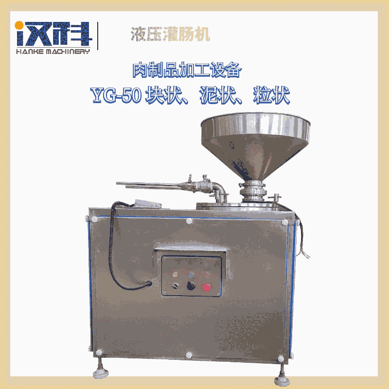 本機(jī)主要由架體、油泵油路系統(tǒng)、擠肉活塞、料斗等組成。這種灌腸機(jī)操作省力、壓力也比較穩(wěn)定、基本上能保證工藝要求,但屬于間歇操作。